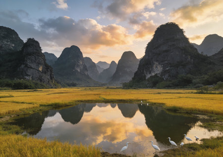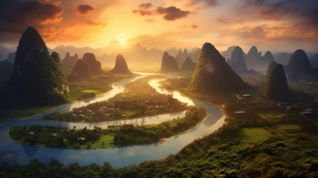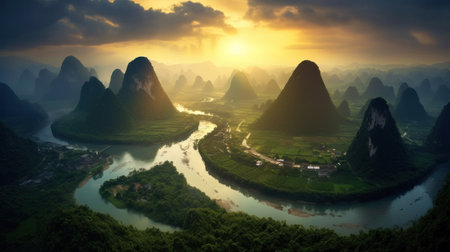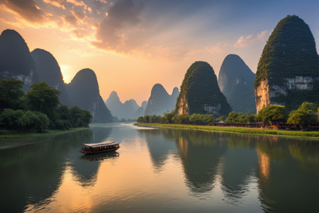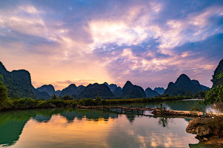 Sunset scene in Guilin, China, with stunning rock and river