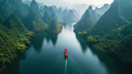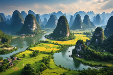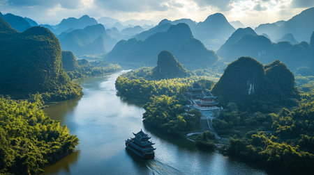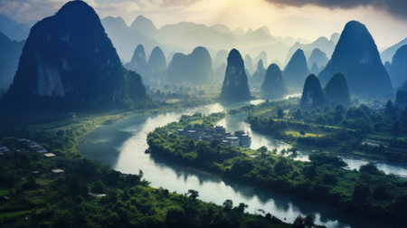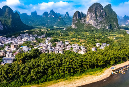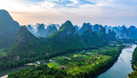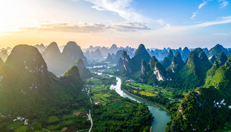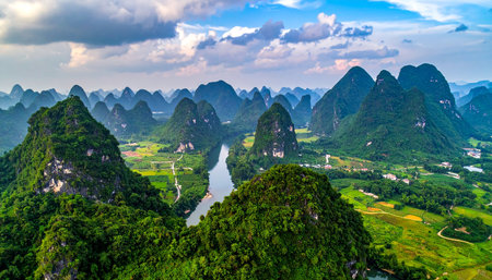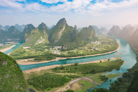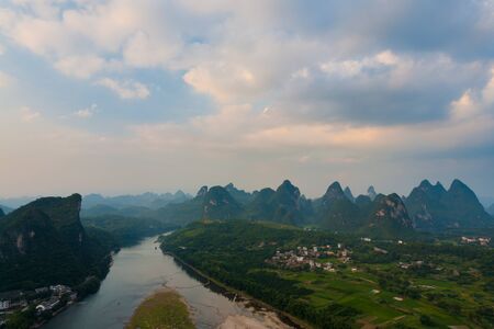 Panoramic view of karst mountains and Li River in Guilin, China