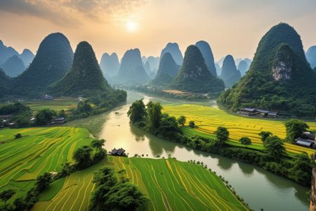 Early morning light washes over a picturesque karst landscape with a meandering river and vibrant green fields
