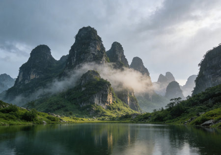 Guilin landscape shrouded in morning mist