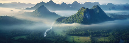 Aerial view of Foggy landscape in the jungle. Fog and cloud mountain tropic valley landscape. Generative Ai
