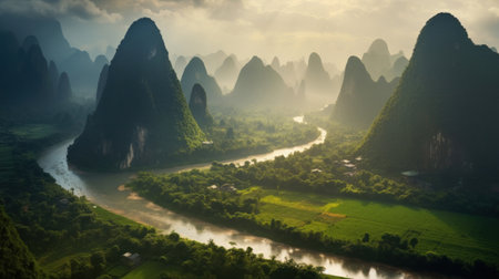 Sunlight over the beautiful karst landscape of Xingping, Guilin, China