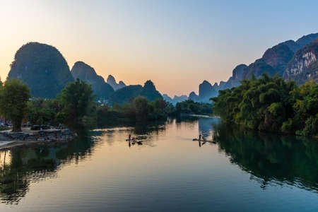 YANGSHUO, CHINA, 6 DECEMBER 2019: Beautiful sunset on the Yulong River in Yangshuo, Guilin, Guangxi