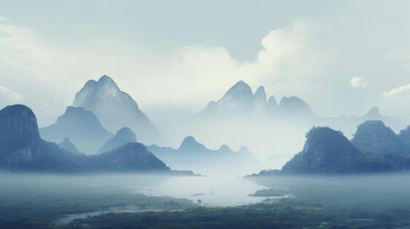 mountain ridge in the sky: a breathtaking uhd image capturing a traditional chinese landscape, featuring a majestic mountain ridge amidst romantic riverscapes. the mist adds an ethereal touch, reminiscent of mediterranean landscapes. this serene scene embodies the essence of zen minimalism, transporting you to a world of tranquility and natural beauty. ai generated