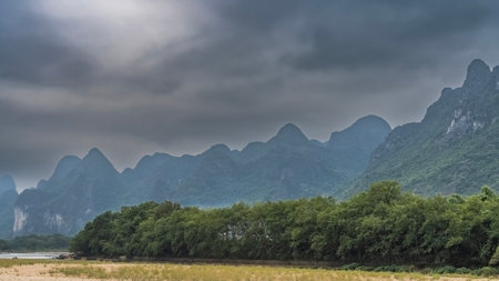 scenery of the Yulong River in Guangxi covered the distant mountains with clouds and mist.