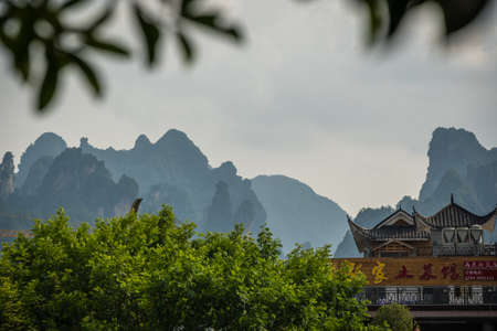 Wulingyuan, China - August 2019 : Rooftops of traditional chinese buildings with the stunningly beautiful rocky karst mountain formations behind as seen from the centre of town, Hunan Province