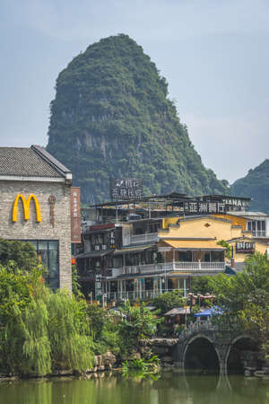 Yangshuo, China - October 20,2016: Buildings and mountain landscape of Yangshuo Town on October 20,2016 in Guangxi province,China.. It is famous destination in China with beautiful karst hills.