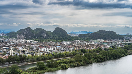 Urban landscape, view from a height. There are many multi-storey buildings. Green vegetation on the river bank. Picturesque mountains against the sky and clouds. China. Guilin