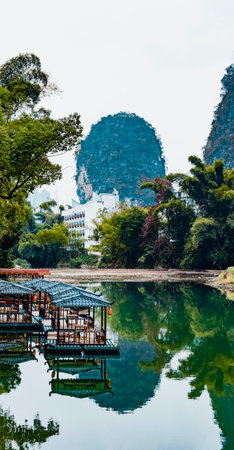 Yangshuo, China - August 2019 : Image of a ferry boat waiting for passengers on the shore of the Li river in summer