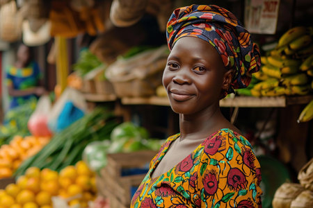Portrait of a young African woman smiling at the market.