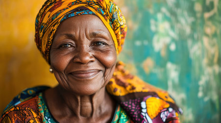 Smiling Portrait of an Elderly African Woman with Headscarf in Traditional Clothing with Smooth Colorful Background