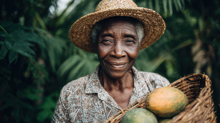 Smiling elderly woman wearing straw hat holds basket filled with fresh fruits, surrounded by lush greenery. Her warm expression reflects connection to nature and joy of harvesting