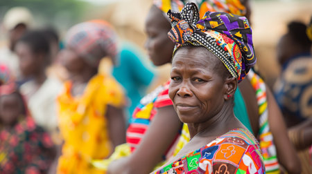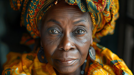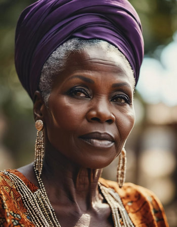 A graceful elder woman adorned in colorful traditional clothing and an ornate headwrap stands confidently amidst a sunlit background, radiating wisdom and heritage.