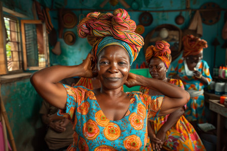 Two women wearing colorful headdresses and standing next to each other, AI
