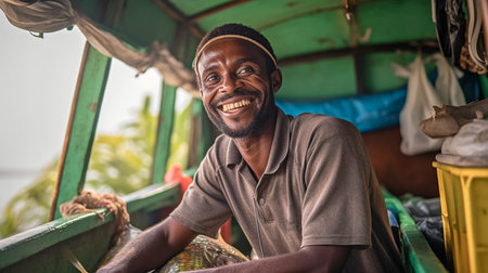 Inside a fishing boat, a fisherman beams while holding a fish box. GENERATE AI