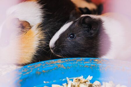 Guinea pig sits in sawdust. Pet rodent