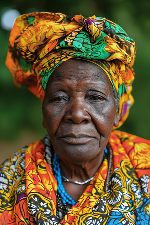 Portrait of elderly African woman in colorful ethnic clothes.