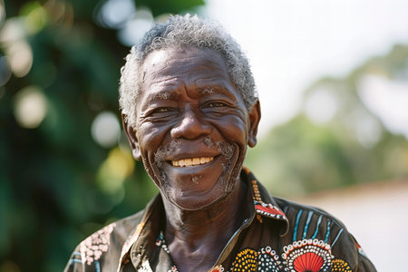 An elderly man wearing vibrant traditional clothing and hat, smiling warmly against a blurred natural background. The image highlights cultural pride, wisdom, and a cheerful atmosphere.