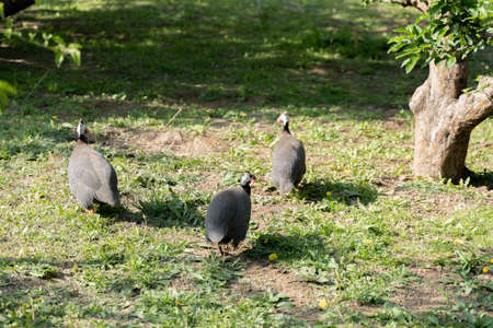A group of guinea fowls, two roosters, and a hen graze on a green lawn in the park. Birds with bright colorful and variegated plumage calmly walk on the grass. Mauritius.