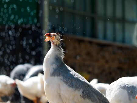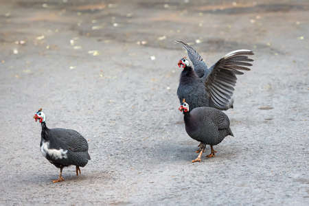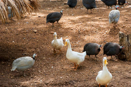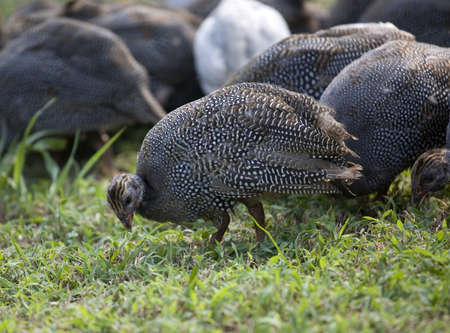 Helmeted guinea fowl chicken rooster duck ducks goose geese bird birds flock group together feed eat feeding eating pick picking on farm in Patong Beach Kathu Phuket Island Thailand.