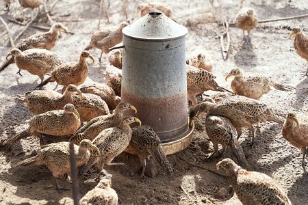 Many female common pheasants on the bird breeding farm gathered around a feeding trough. All birds are wearing plastic beak attachments to prevent feather pecking and fights.