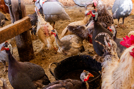 adult dark guinea fowl, speckled plumage, red earrings near beak, poultry farming, portrait, close-up, dark background, on floor in chicken coop, farm, house,