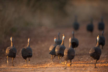 Flock of Helmeted Guinea Fowl walking along a road in the late afternoon sun
