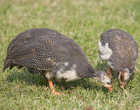 Helmeted guineafowl Numida meleagris reichnowi foraging for food.