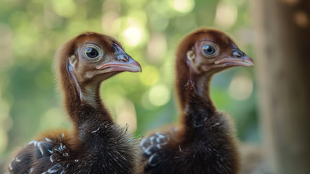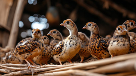 domestic japanese quail kept baby chickens are kept in a brooder in a hen house, close-up