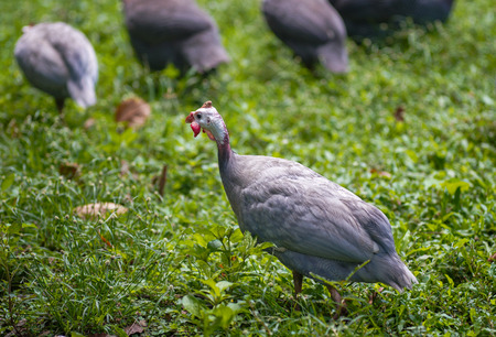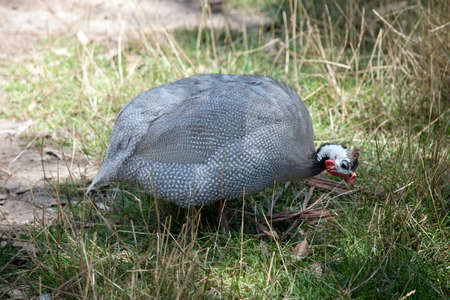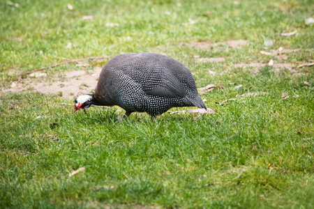 the Helmeted Guinea fowl is looking for food in the grass