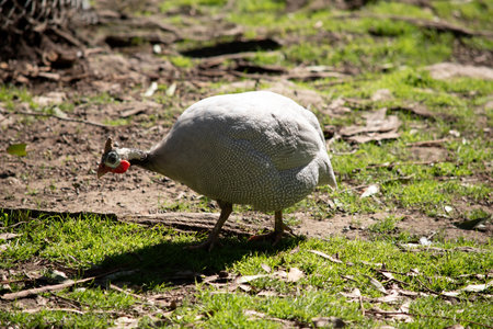 White siberian helmeted guinea fowl on free range in organic farm. Poultry numida meleagris with red head and white feather in intensive poultry farming. Hen bird looking walking.