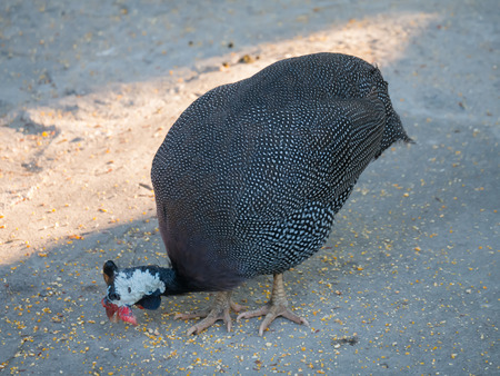 Helmeted guineafowl Numida meleagris reichnowi foraging for food.