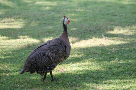 Wild guinea hen on a green grass
