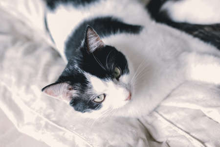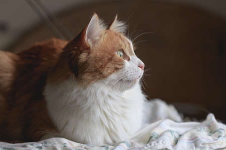 Portrait of a beautiful domestic cat lies in her bed near the window.