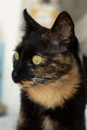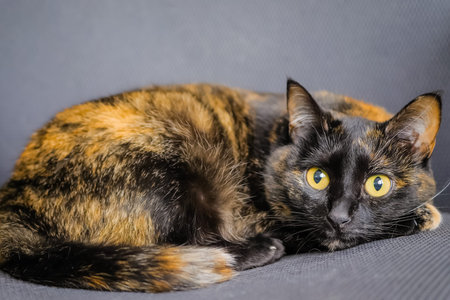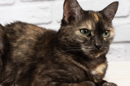 Beautiful domestic tricolor cat with green eyes sits on the couch and looks to the side. Close-up, selective focus.