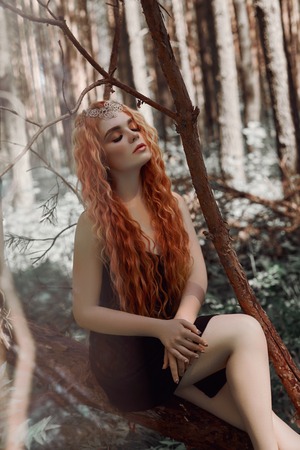 Romantic woman with red hair lying in the grass in the woods. A girl in a light black dress sleeps and dreams in a magical forest
