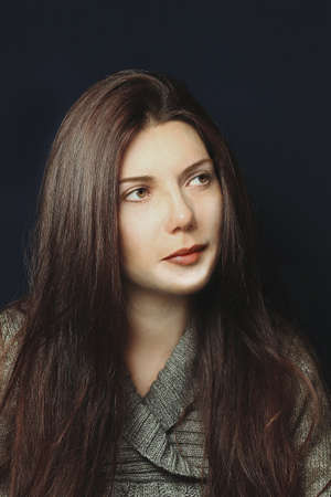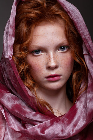 Beautiful portrait of a red-haired teenager girl. With beautiful makeup and image on a dark background.