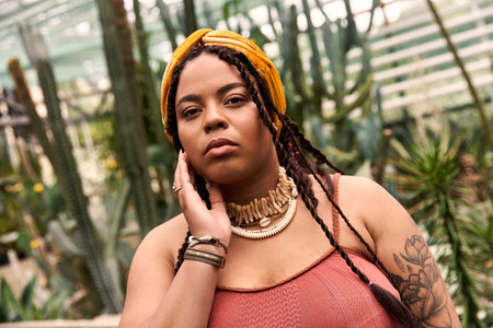 A pretty african american woman in a dress poses gracefully among vibrant plants in a greenhouse.