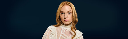 Portrait of red-haired girl on the background of blue wall. Redhead.