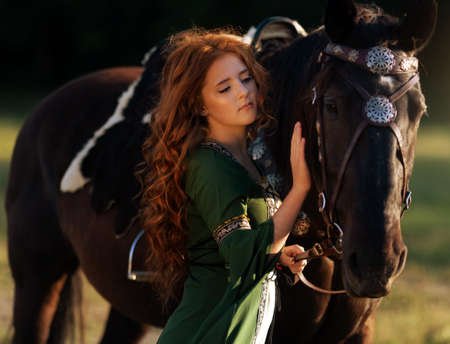Beautiful red haired girl in metal medieval armor dress with sword standing in warlike pose and looking at camera with fearless. Fairy tale story about warrior. Warm art work.