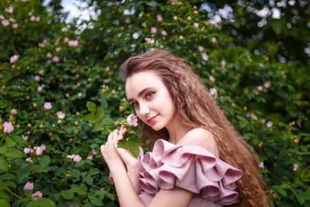 Teenager girl with curly long hair in pink costume at rose hip blooming bush. Springtime blossoming and tender youth concept.