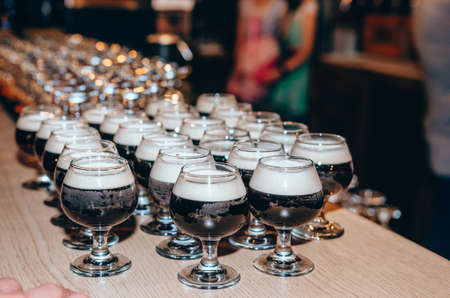 Set of glasses of dark beer in pub or restaurant. Degustation set at the festival