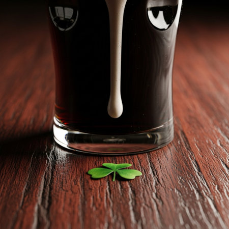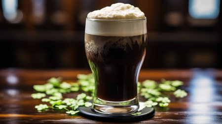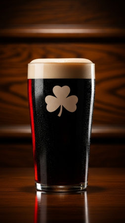 Closeup of dark stout beer with creamy head and shamrock imprint. Festive pub drink concept for St Patricks Day.