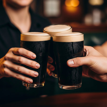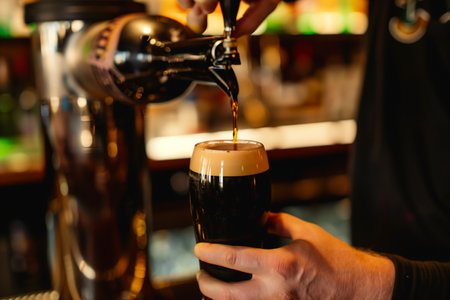 Close-up shot of dark beer being poured from a tap into a glass, held by a persons hand. The beer is creating a tan, foamy head, in a bar or pub. The warm lighting adds to the ambiance.