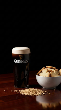 A dramatic, vertical 9:16 still life showcasing a perfect pint of Guinness stout and shamrock shortb