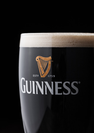 LONDON, UK - NOVEMBER 29, 2016: Glass of Guinness original beer on black background. Guinness beer has been produced since 1759 in Dublin, Ireland.