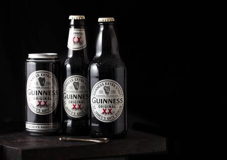 LONDON, UK - APRIL 27, 2018: Aluminium can and bottles of Guinness extra stout beer on dark wooden background. Guinness beer has been produced since 1759 in Dublin, Ireland.
