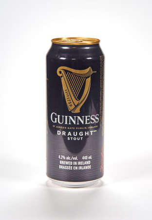Montreal, Canada - March 15, 2020: A can of dark Guinness beer over white background. Guinness is a dark Irish dry stout that originated in the brewery of Arthur Guinness
