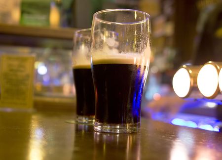 DUBLIN, IRELAND - JUNE 19, 2008: Two pints of beer served at The Guinness Brewery on June 19, 2008. Brewery where 2.5 million pints of stout are brewed daily was founded by Arthur Guinness in 1759