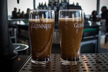 DUBLIN, IRELAND - FEBRUARY 7, 2017: Two pints of Guinness on the stand